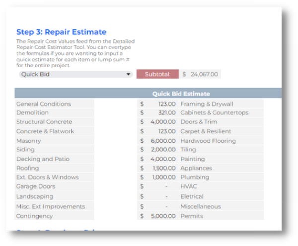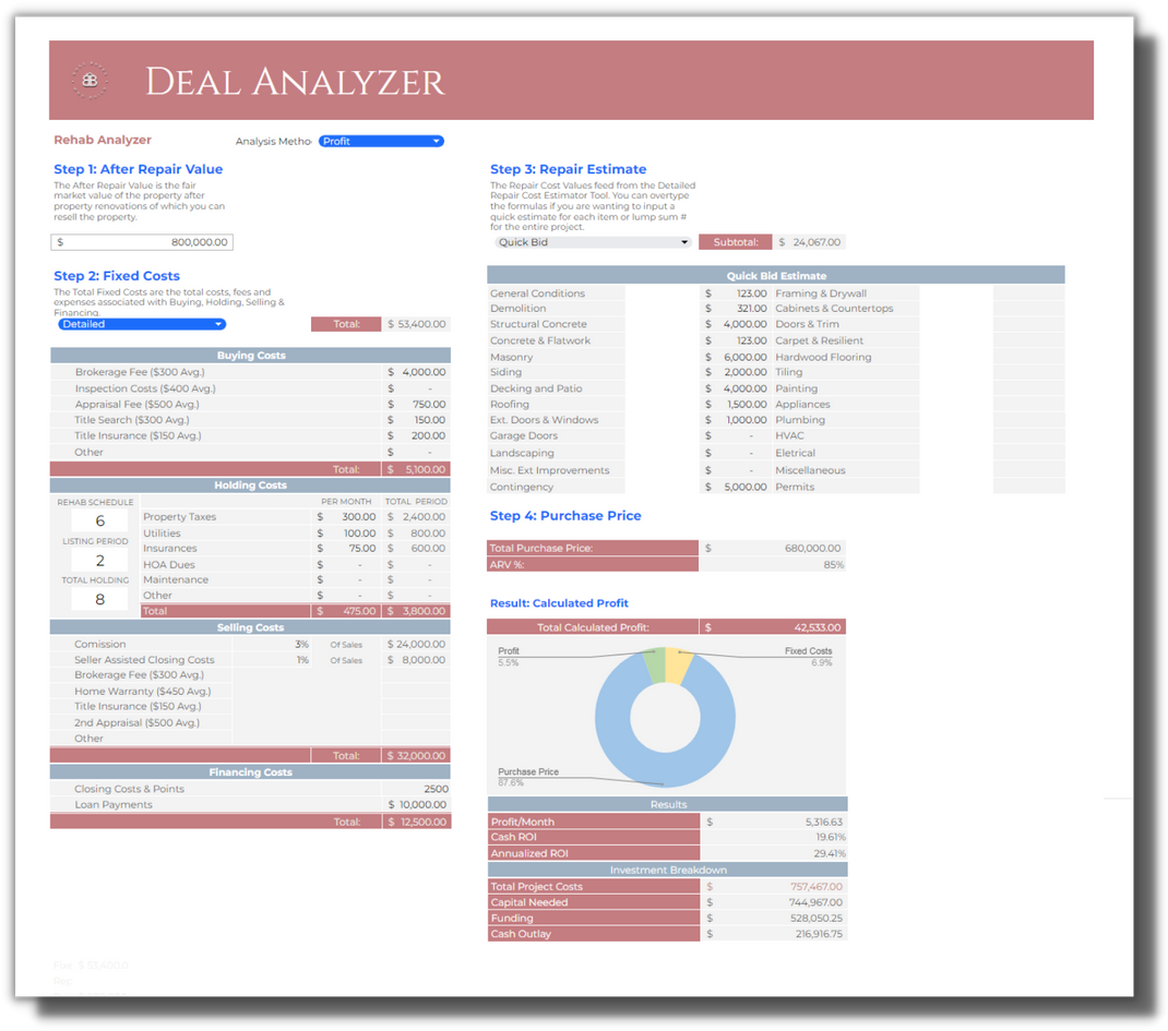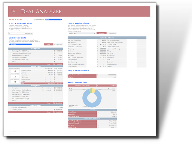 Using the deal analyzer, I was able to accurately assess the maximum purchase price I should offer for a property and create detailed repair budgets that accounted for all possible expenses.